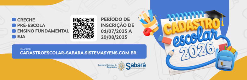 O cadastro será feito de forma online, pelo site: cadastroescolar-sabara.sistemasyens.com.br