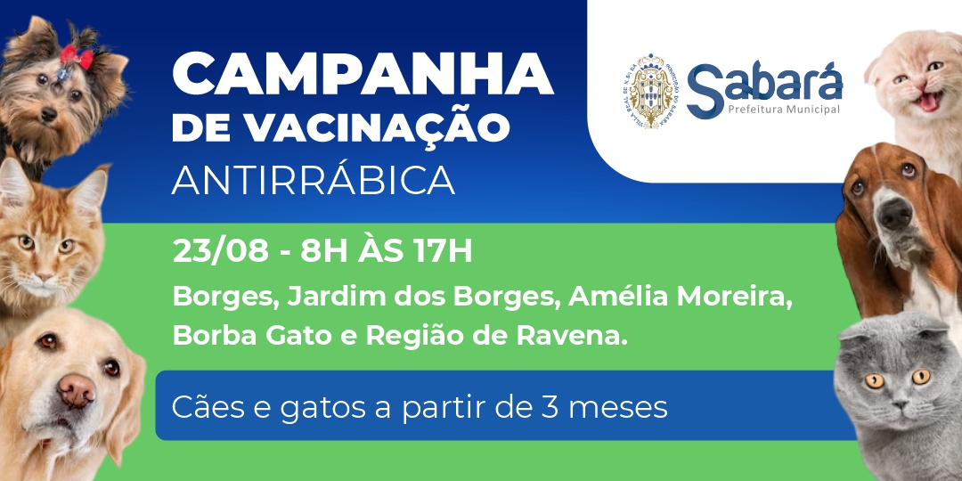 A Prefeitura de Sabará dá início, neste sábado (23/08), à primeira etapa da Campanha de Vacinação Antirrábica no município. A ação, coordenada pela Secretaria de Saúde e pelo Centro de Controle de Zoonoses, é destinada a cães e gatos a partir de três meses de idade. Os postos de vacinação funcionarão das 8h às 17h nos bairros Borges, Jardim dos Borges, Amélia Moreira, Borba Gato e também na região de Ravena. A imunização é gratuita e essencial para a proteção dos animais e da população contra a raiva, doença grave e letal.