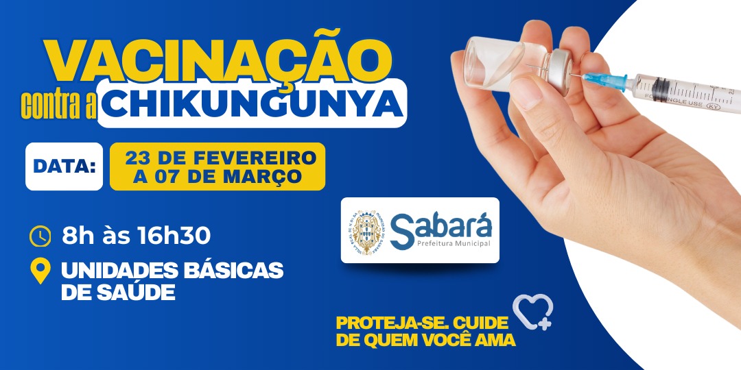 A Prefeitura de Sabará, por meio da Secretaria Municipal de Saúde, promove, entre os dias 23 de fevereiro e 7 de março, a campanha de vacinação contra a chikungunya. A imunização é destinada a moradores do município com idades entre 18 e 59 anos e estará disponível nas salas de vacina das unidades de saúde, exceto na unidade do Pompéu, das 8h às 16h30. Para receber a dose, é necessário apresentar documento oficial com foto e o cartão de vacina.