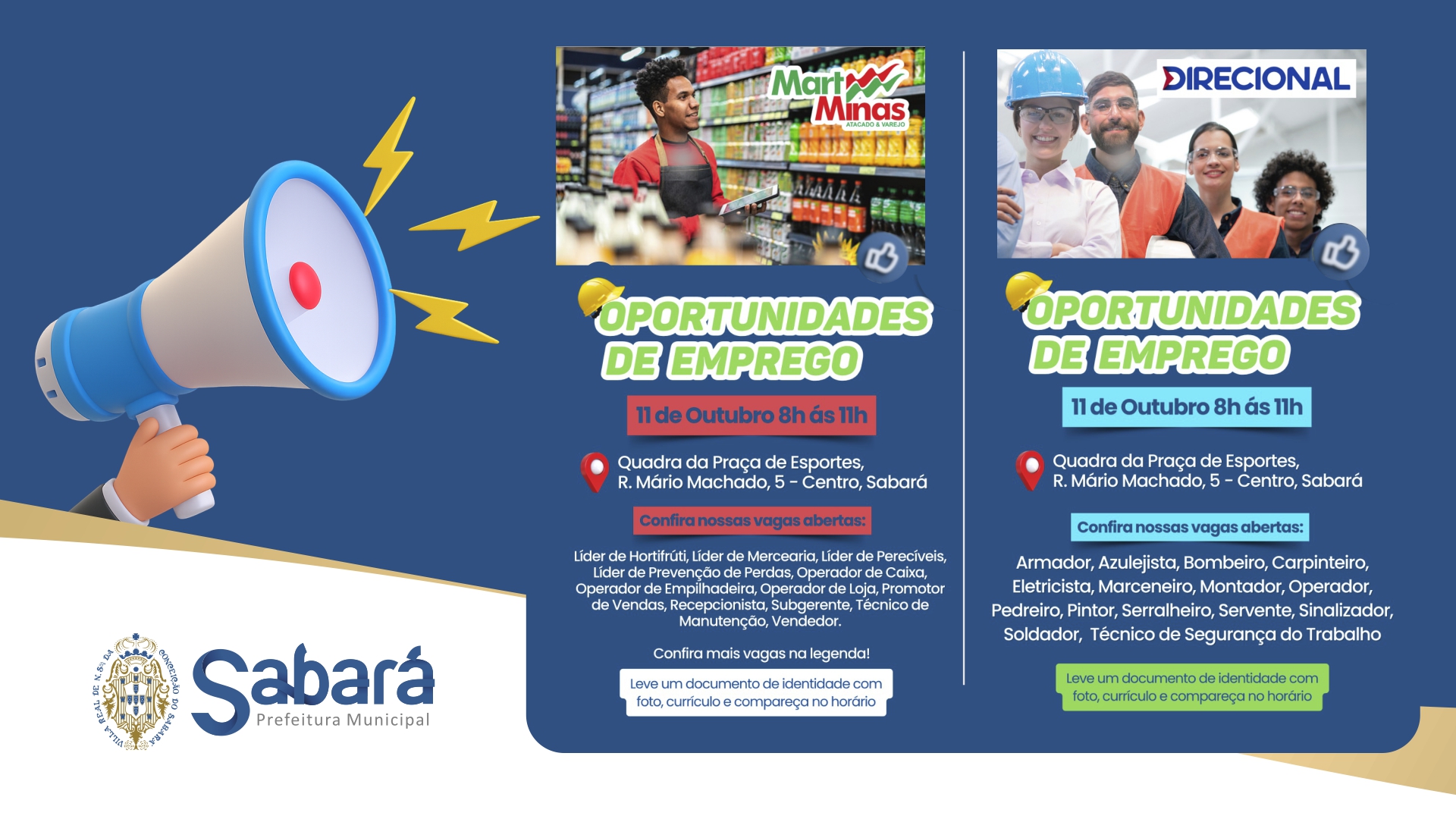A Prefeitura de Sabará, em parceria com as empresas Direcional Engenharia e MartMinas, realizará no dia 11 de outubro, das 8h às 11h, um grande mutirão de empregos presenciais na Quadra da Praça de Esportes, localizada na Rua Mário Machado, nº 5, no Centro de Sabará.