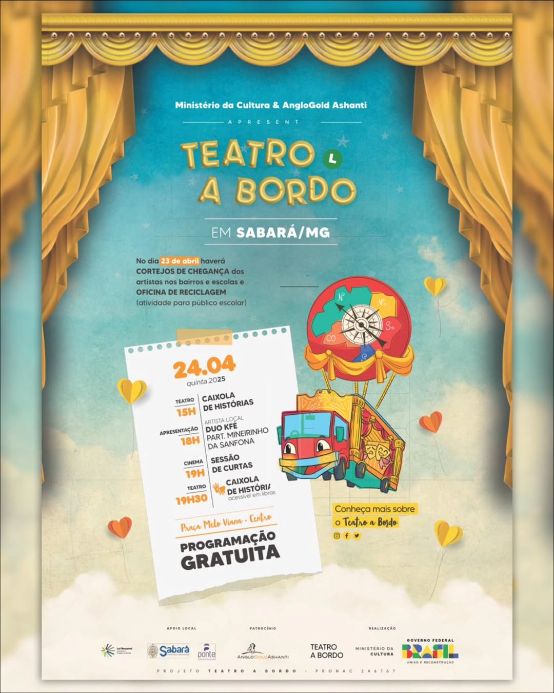 Na quinta-feira (24/4), a partir das 15h, é a vez da comunidade se encantar com as apresentações teatrais do Teatro a Bordo e com performances de artistas locais, na Praça Melo Viana, no Centro de Sabará. Não para por aí! O projeto oferece ainda uma exibição de curtas-metragens. “Na AngloGold, nos sentimos profundamente orgulhosos de apoiar iniciativas como o projeto Teatro a Bordo, que alia cultura, educação e sustentabilidade de forma tão inspiradora. Acreditamos que projetos como este, que promovem a conscientização ambiental e valorizam a arte e a cultura local, são fundamentais para o fortalecimento das comunidades”, comenta o diretor de Comunicação, Comunidades e Relações Governamentais, Fernando Cláudio.